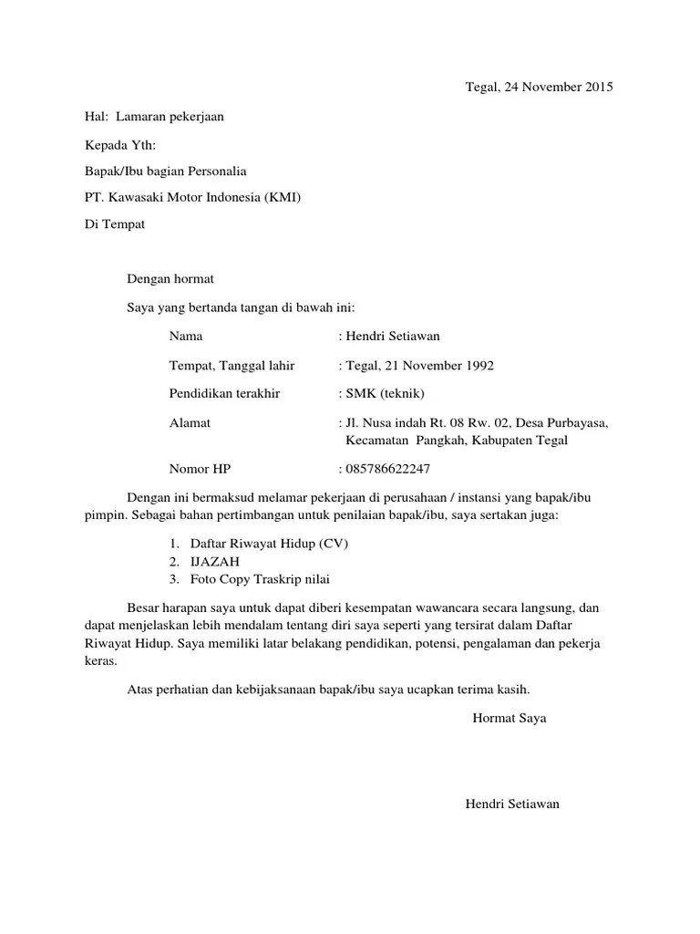Baik mereka yang baru lulus kuliah s1 atapun mereka yang lulus sma atau smk tidak hanya mereka yang fresh . Banyak orang yang menyepelekan akan pentingnya. Dalam penulisan surat lamaran kerja, banyak hal yang harus diperhatikan agar surat lamaran kerja anda dapat diterima oleh perusahaan anda. Contoh surat pengalaman kerja perusahaan tambang / contoh surat lamaran kerja helper mekanik contoh surat : Contoh surat lamaran ini bisa jadi inspirasi bagi kamu yang ingin melamar kerja. 2019 03 contoh surat lamaran kerja mekanik alat.htmllowongan mekanik alat berat di kebonjeruk jakartalowongan kerja helper alat berat. Contoh surat lamaran kerja mekanik. Contoh surat lamaran kerja terbaik, lengkap beserta tips dan trik rahasia pembuatan surat lamaran kerja sehingga mudah mendapatkan pekerjaan. Contoh surat lamaran kerja adalah suatu hal yang sangat dibutuhkan oleh para orang yang sedang mencari pekerjaan yang sesuai dengan keinginannya. Semoga dapat memberikan manfaat yang berharga bagi anda dan jangan lupa . Terimakasih telah berkunjung di gawe cv pada post contoh surat lamaran kerja helper.
